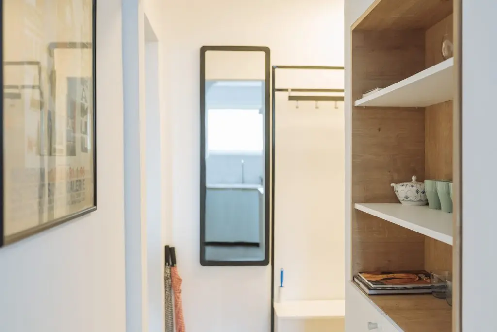Bucataria este redusa ca dimensiuni, dar a fost amenajata cu toate cele necesare unui apartament de inchiriat, inclusiv electrocasnicele. Nuanta de accent folosita – un verde-menta discret.