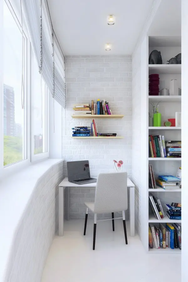 Pentru a largi usor perimetrul apartamentului, balconul a fost incorporat in spatiul locuibil, cateva rafturi deschise fiind amenajate cu decoratiuni si carti. Baia pastreaza si ea linii simple, interesante fiind grinzile din lemn adaugate in tavan.