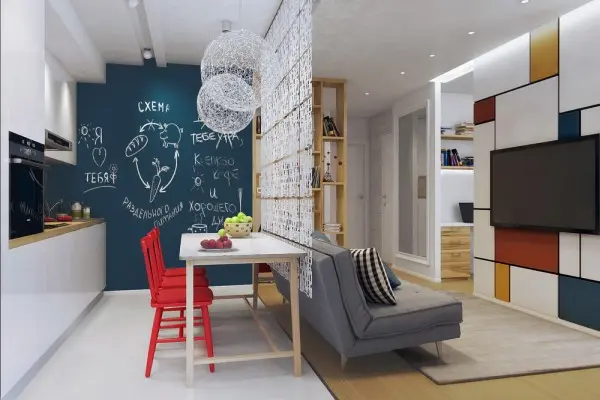 Camera principala cuprinde zona de zi cu living si bucatarie. Desi aflate in acelasi perimetru, cele doua sunt despartite la nivel vizual de un separator creativ, in forma unei draperii fine amplasata in tavan intre canapea si masa. Spatiul nu este intrerupt in niciun fel, asigurandu-se continuitate camerei. O idee excelenta de pus in practica in spatii asemanatoare din garsoniere sau studiouri.