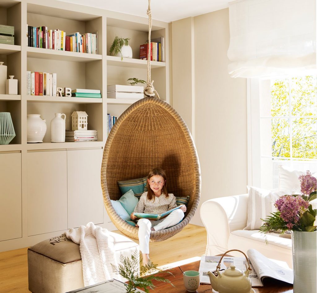 Livingul – un spatiu primitor, luminos gratie nuantelor calde alese si a luminii naturale care patrunde in incapere.Diningul este inclus in spatiul livingului si se armonizeaza cu intregul decorO biblioteca incastrata salveaza din spatiu; leaganul din ratan aduce un aer placut incaperiiDetalii fine si texturi bogate pentru living