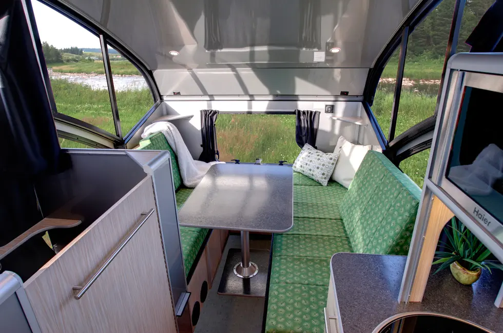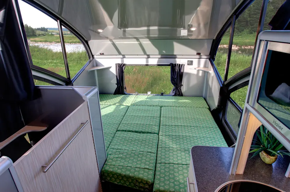 Acoperisul acestui “apartament”, construit din rulota aceasta mobila, este unul retractabil care iti ofera o priveliste uimitoare, in timp ce stai intins in pat, relaxandu-te intr-o excursie de vis.