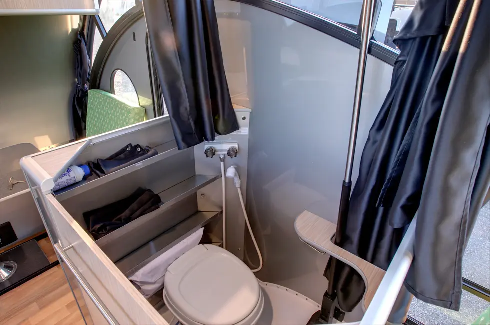 Aceasta rulota mobila este dotata cu toate utilitatile necesare pentru a locui extrem de confortabil in orice excursie pe care o vei face, fiind dotata cu toaleta, dus, apa calda, apa rece, aragaz pentru gatit si un pat de dimensiuni extrem de mari.