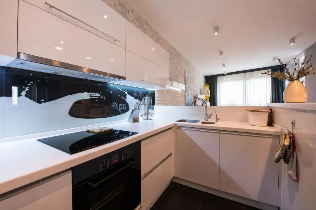 Mobilierul din bucatarie este alb, cu front lucios si un design simplu. Zona placata cu panou de sticla aduce o nota artistica bucatariei prin combinarea albului cu negrul intr-un efect de vopsea stropita.