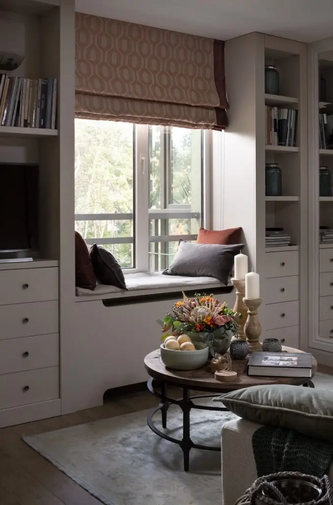 Spatiile de depozitare dintr-un living obisnuit au fost integrate in jurul ferestrei printr-un sistem unitar, cu rafturi pentru carti, sertare, dar si un spatiu pentru televizor. Cele doua corpuri sunt unite printr-o bancuta ce poate fi folosita ca loc de lectura. Amenajarea este intregita printr-o canapea confortabila si o masuta de cafea ce incheaga tot acest decor.