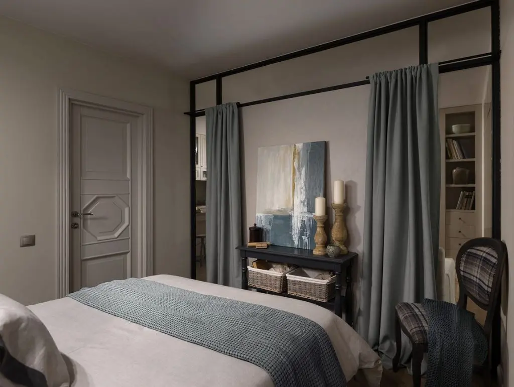 Pentru dormitorul nou creat, designerii au mizat pe un decor elegant, usor feminin, dar si pe obtinerea unei maximum de functionalitate tinand cont de dimensiunile reduse. Desi o parte din depozitare se afla in hol, ei au reusit sa integreze si aici doua corpuri simetrice de dulap unite printr-o scafa cu spoturi. Pentru spatiul cu geam vizibil din living s-au folosit draperii asigurand astfel un nivel optim de intimitate. Cromatic, s-au folosit culori mai reci, estompate pentru a spori confortul vizual in incapere.
