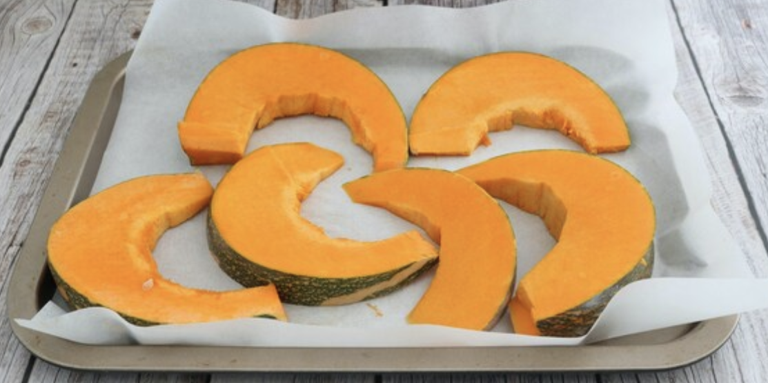 Pregătirea dovleacului: Mai întâi, coace dovleacul în cuptor pentru a elimina excesul de umiditate. Poți să-l cooci cu tot cu coajă timp de aproximativ 30 de minute la 180°C; după coacere, coaja se va îndepărta foarte ușor.