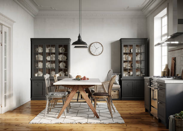 Daca pana in prezent culoarea nu a fost un amanunt pregnant, iata ca a venit si randul ei sa iasa in evidenta alaturi de aceasta masa de dining realizata complet din lemn. Turcoazul inchis (teal) este o alegere suprinzatoare pentru o zona de luat masa, insa, in aceasta combinatie, pare sa fie cea mai buna idee din lume.