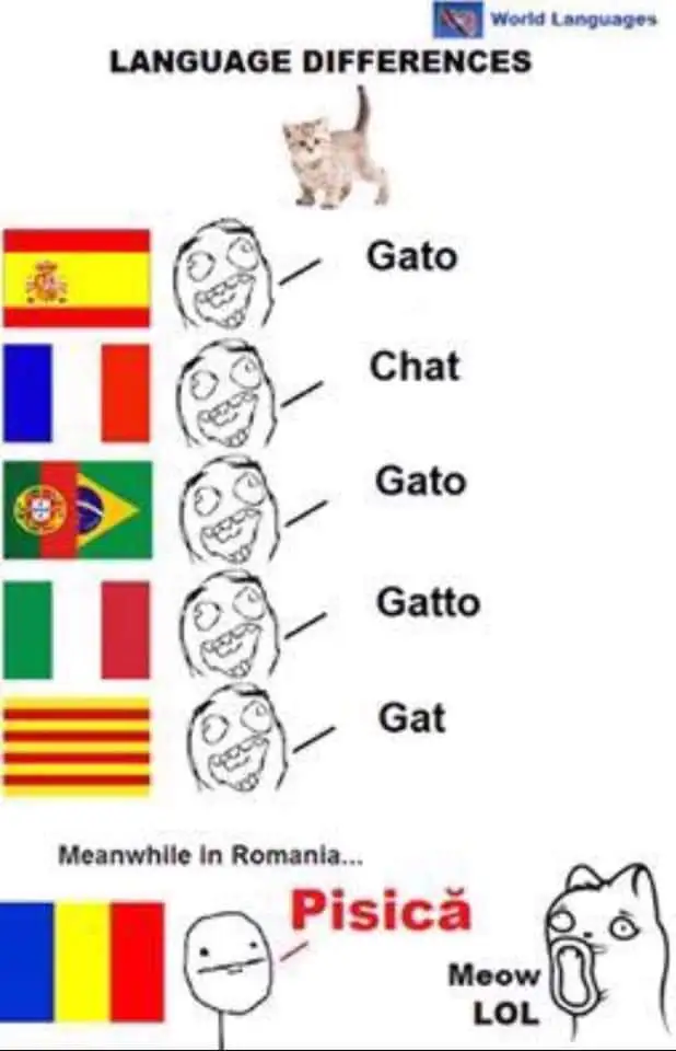 Româna a pierdut termenul din latină- “cattus”, termen care se păstrează și în engleză, cât și în alte limbi. Româna păstrează cuvântul latinesc în “cătușe”, “a încătușa”- pentru că prind ca niște gheare de pisică. Și sarda are “pisittu”.