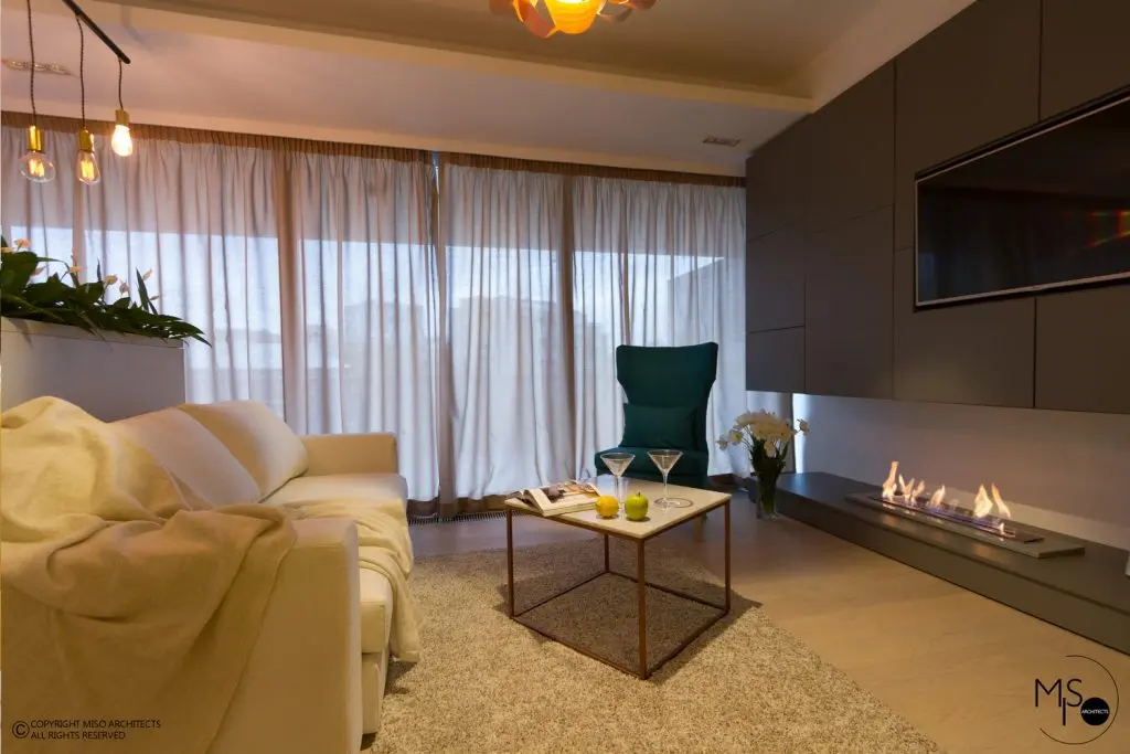 Se poate adopta o amenajare simetrica cu piese de mobilier de o parte si cealalta a semineului. Zona de conversatie, de exemplu, poate fi conturata in jurul semineului, cu 2 sofale asezate simetric sau o canapea si 2 fotolii.