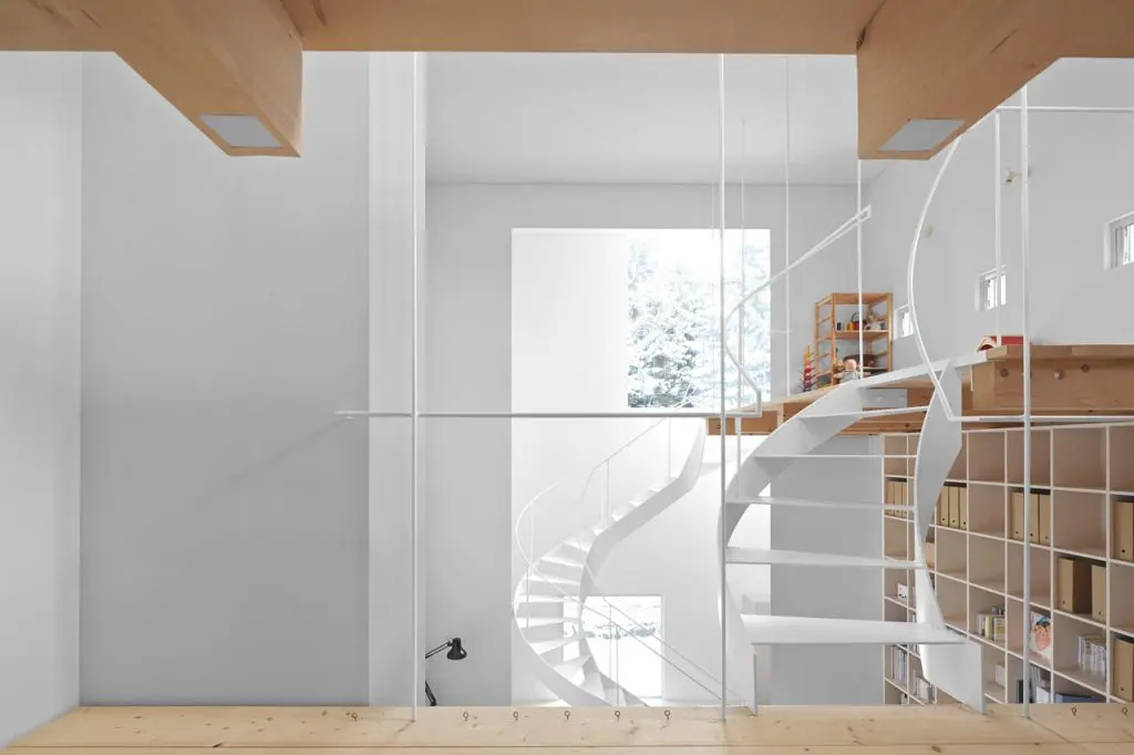 Asocierea lemnului cu albul este trasatura predominanta a decorului, reliefand o structura curata, simpla dar placuta si primitoare chiar jucausa. S-a mizat pe un interior tip open space cu suficiente spatii de depozitare si o biblioteca inalta din tavan pana in podea. Designul minimalist predomina, liniile drepte imbinandu-se armonios cu spiralele create de curbura scarilor.