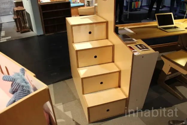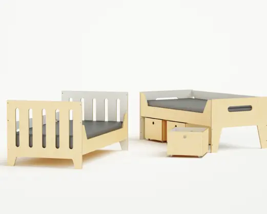 Acest patut pentru bebelusi se transforma, odata ce copilul a crescut si nu mai are nevoie de el, intr-un pat supraetajat cu birou, in doua paturi supraetajate sau intr-un pat supraetajat cu mai multe spatii de depozitare in scarile aflate in aceasta piesa inedita de mobilier.