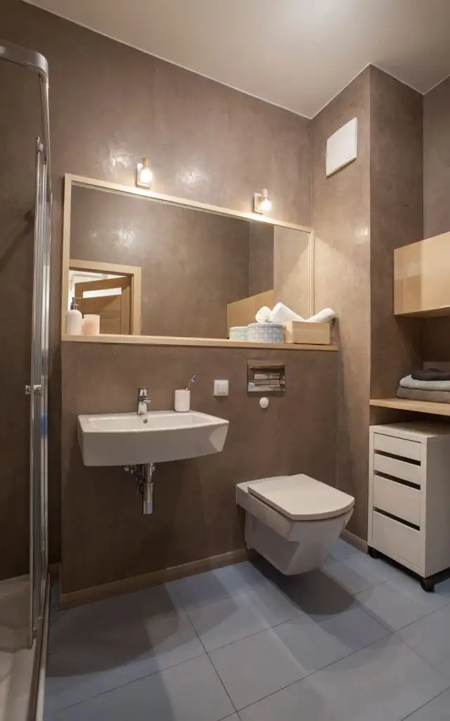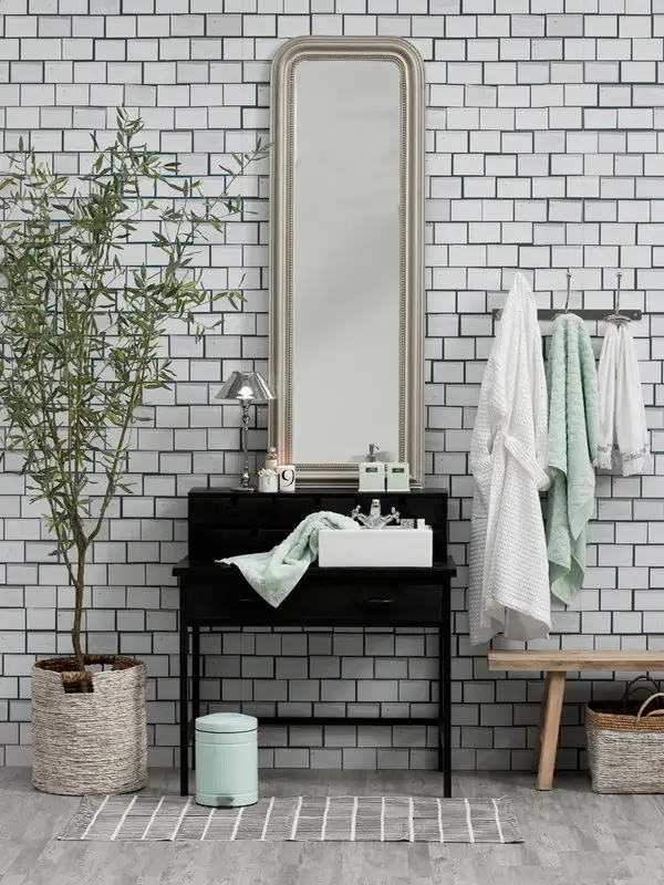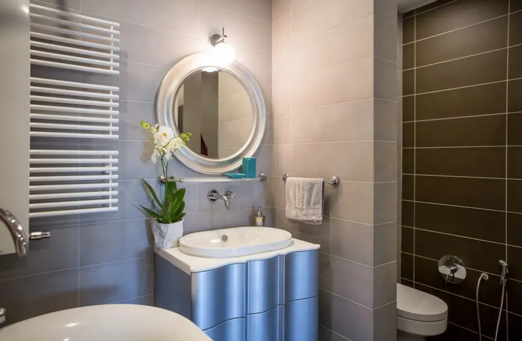 Model de oglinda pe masura spatiului. De remarcat ca aceasta nu depaseste linia lavoarului, conturand o simetrie pentru decor.