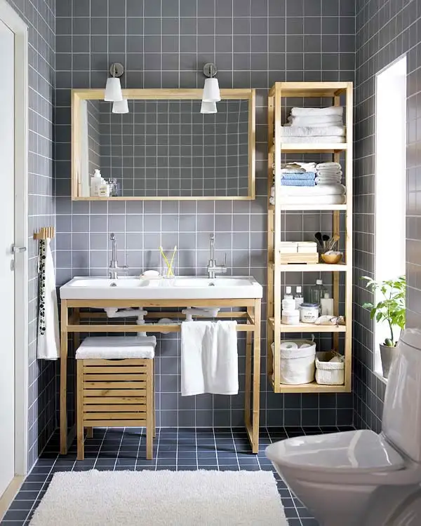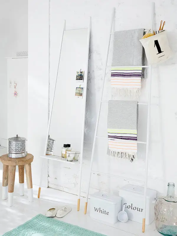 Ne place cateodata sa iesim din banal si sa gasim abordari inedite. Pentru cei curajosi propunem varianta a doua scari decorative si functionale in acelasi timp. Una din ele, sa fie folosita ca suport pentru prosoape, iar cea de-a doua ca suport pentru oglinda sau chiar cu o oglinda integrata in locul treptelor.