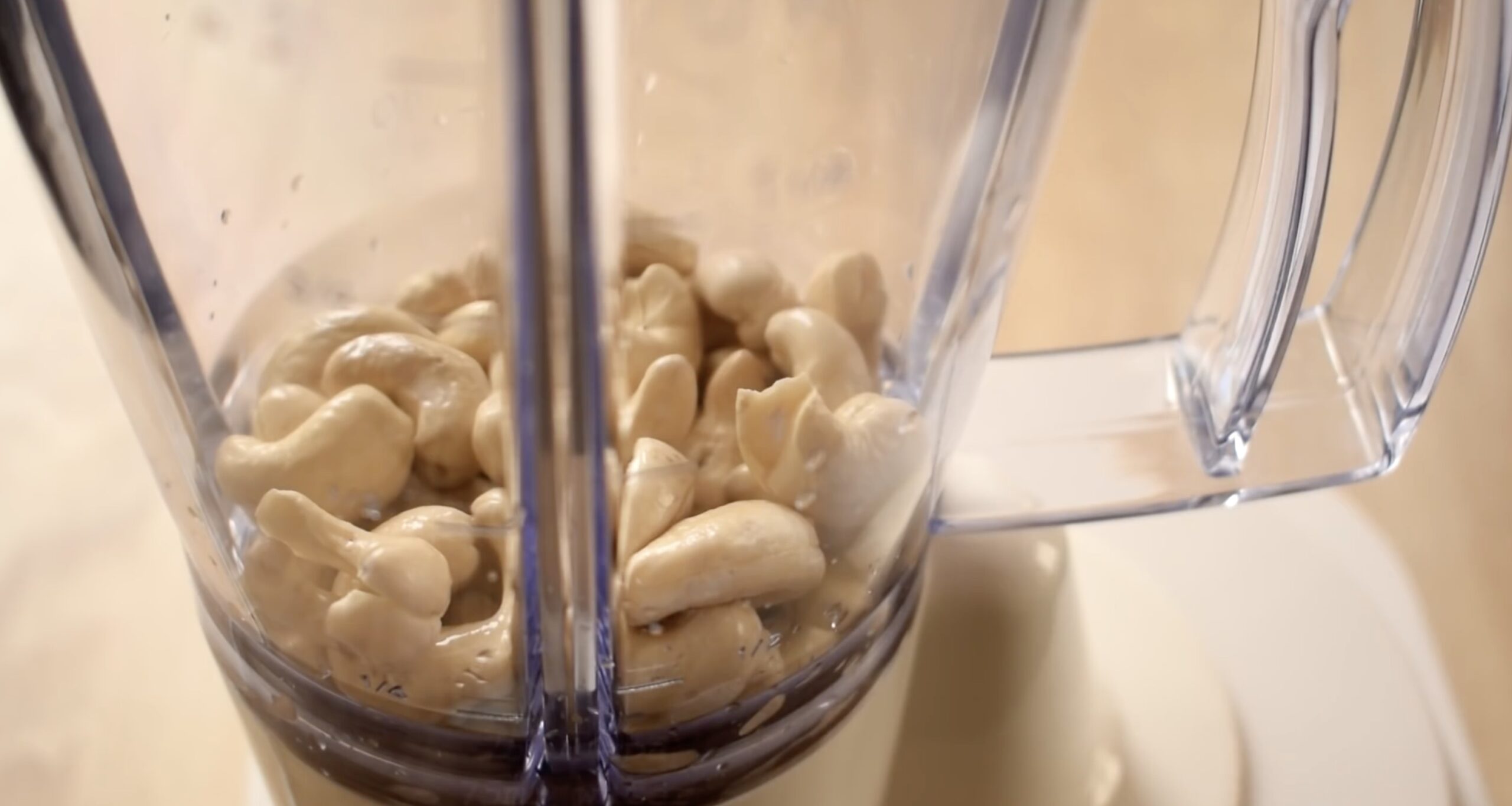Mixează caju hidratat cu laptele vegetal până obții o cremă fină. Adaugă drojdia inactivă și turmeric, dacă folosești.