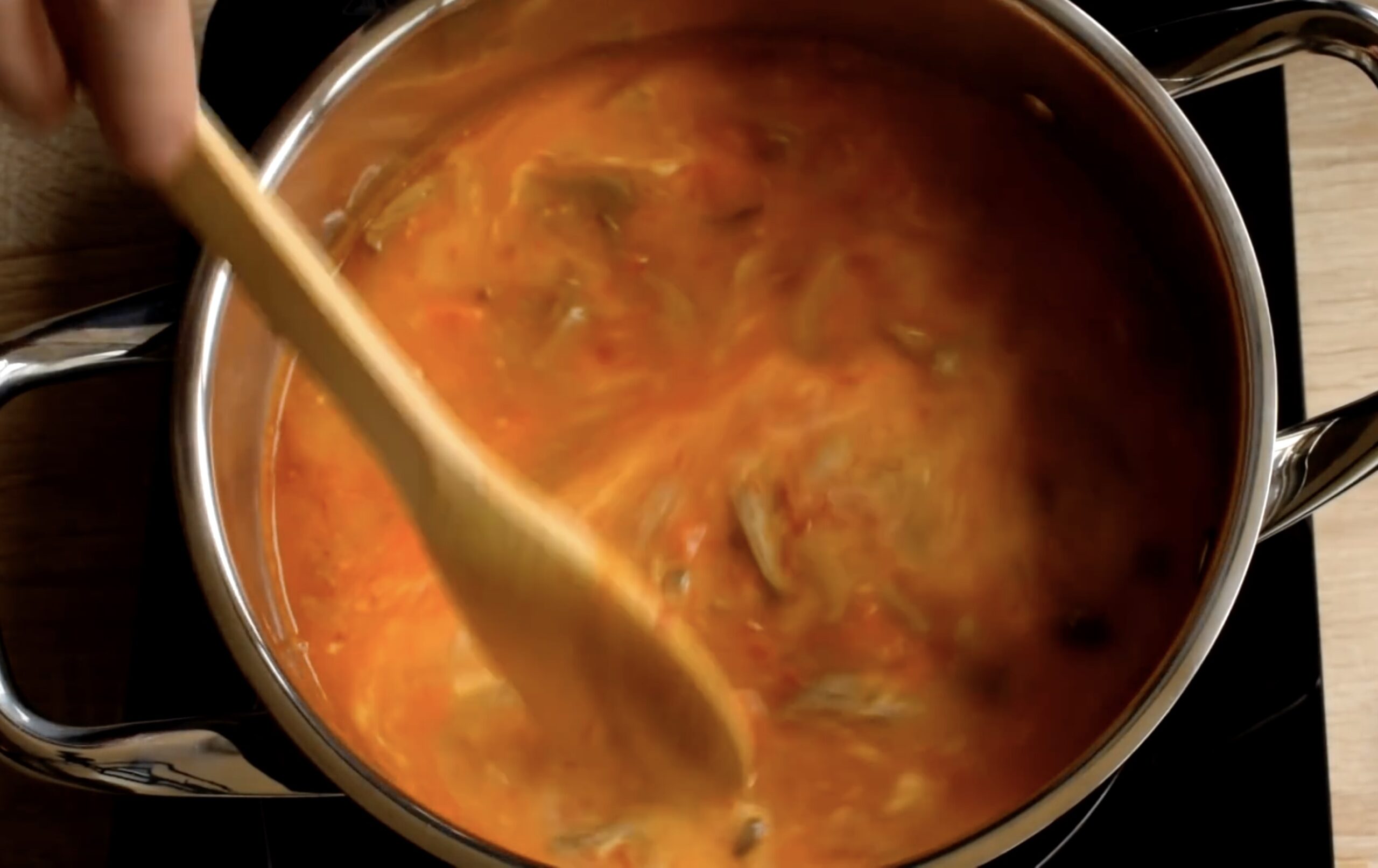 Toarnă treptat crema de caju în ciorbă, amestecând continuu.