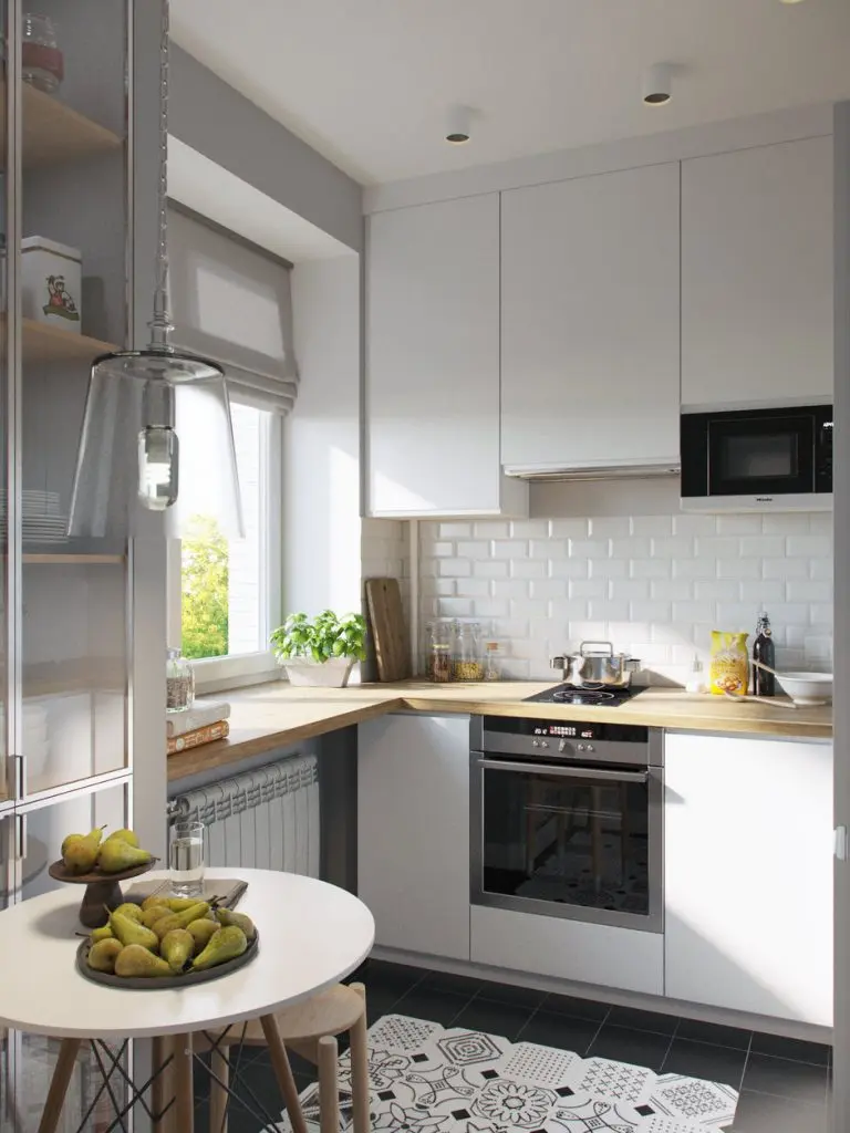 Fiind nevoita sa foloseasca cu precizie fiecare metru patrat, in bucatarie, au fost alese dulapuri inalte pana in tavan, avand astfel mai mult loc pentru depozitare. Albul mobilierului si al placilor ceramice tip Metro este completat de negrul gresiei. Modelul placilor decorative sparg din monotonia spatiului monoton. Blatul de lucru se continua si deasupra caloriferului din dreptul ferestrei pentru un plus de spatiu necesar atunci cand se gateste.