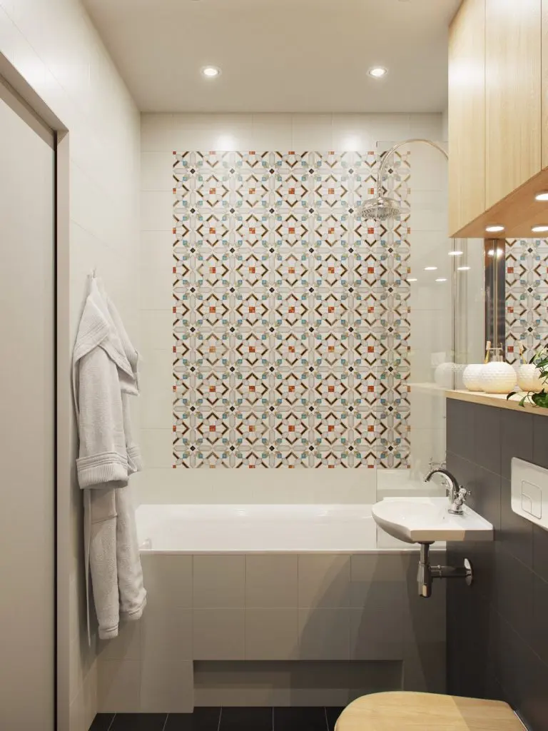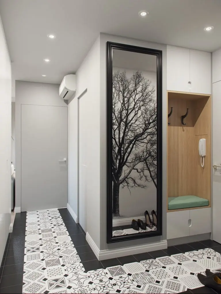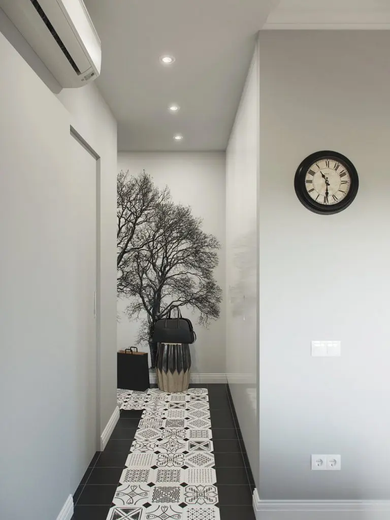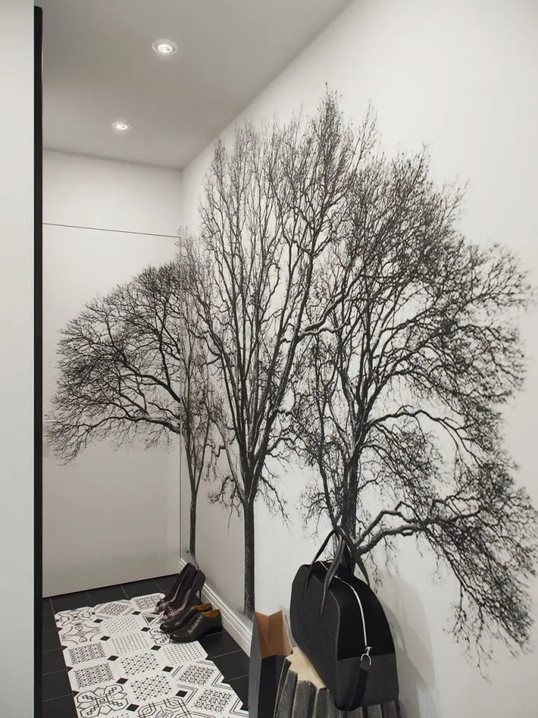 In hol au fost amenajare dulapurile ce preiau principala functie de depozitare din acest apartament. Pentru a distrage atentia de la spatiul ingust, placile decorative din bucatarie se continua si in hol, iar pe peretele de la intrare, fototapetul rupe ritmul monoton al albului. Un alt truc care sprijina decorul holului este oglinda inalta cu rama neagra. Recomandam acest model si chiar si pozitionarea pentru efectul sau de marire a spatiului. Si iluminatul joaca un rol important, fiecare colt primind o cantitate suficienta de lumina.