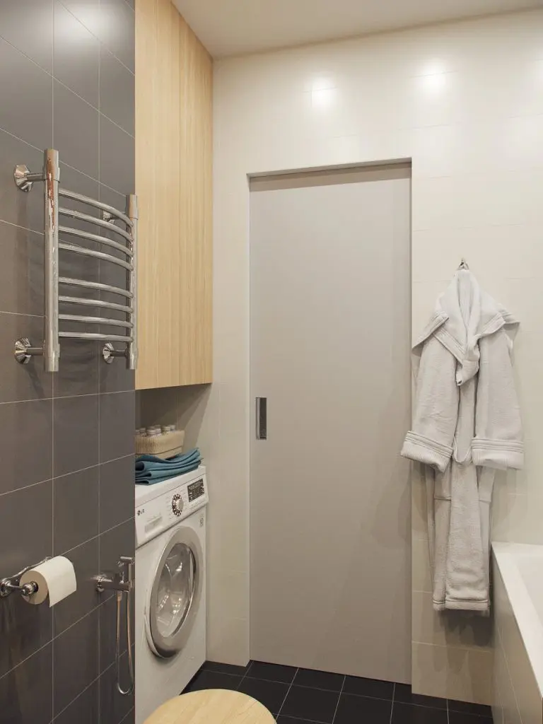 Si amenajarea baii a fost o provocare din nevoia de a introduce si masina de spalat rufe. Solutiile alese permit utilizarea baii in mod optim. Spatiul pardoselii a fost lasat liber (chiar si vasul de toaleta este suspendat). Dulapurile inalte pana in tavan asigura nevoia de stocare a diferitelor produse cosmetice si detergenti. Usa batanta a fost inlocuita cu una glisanta, optimizand astfel spatiul avut la dispozitie.