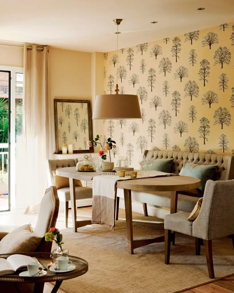 Amenajare cu tapet asezat pe peretele cu diningul creeaza o zona de accent ce pune in valoare spatiul.