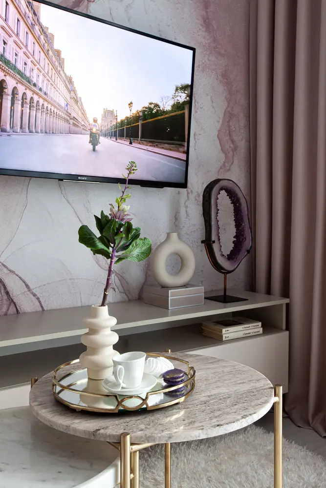 Regasim un model placut de catifea la mobilierul tapitat, covorul pufos din fata canapelei , draperiile de tip blackout din material textil intr-o nuanta calda de roz prafuit. Toate acestea contribuie cu succes la conturarea unei atmosfere calduroase si confortabile.