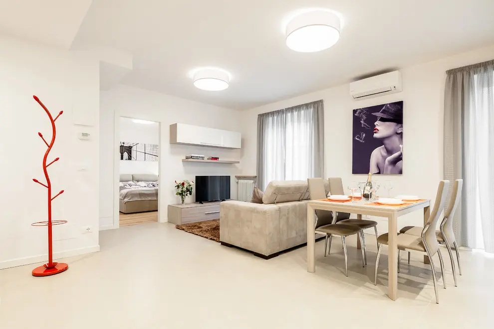 Tot in living, decorul elegant se imbina cu mobilierul simplu, in culori neutre. Insa cuierul si florile rosii sunt cele care sparg monotonia albului. Mobilierul alb si textura lemnului din care este realizat blatul sunt prezente si in bucatarie si confera un aspect luminos si aerisit amenajarii. In imediata apropiere a bucatariei regasim o zona pentru luat masa potrivita pentru patru persoane.