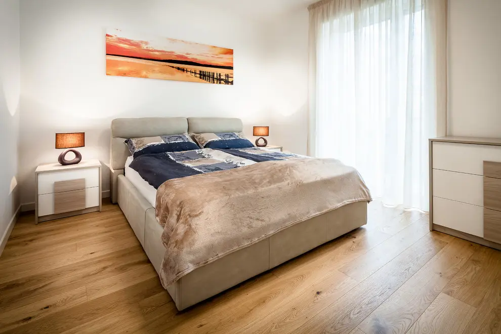 In dormitor se contureaza o atmosfera placuta, odihnitoare, datorita paletei de culori alcatuita din bejuri, texturi de lemn si alb. Abundenta textilelor de pe tablia de pat, pernele decorative, cuvertura si perdele imbogatesc vizual spatiul si il fac locul potrivit pentru un somn odihnitor.