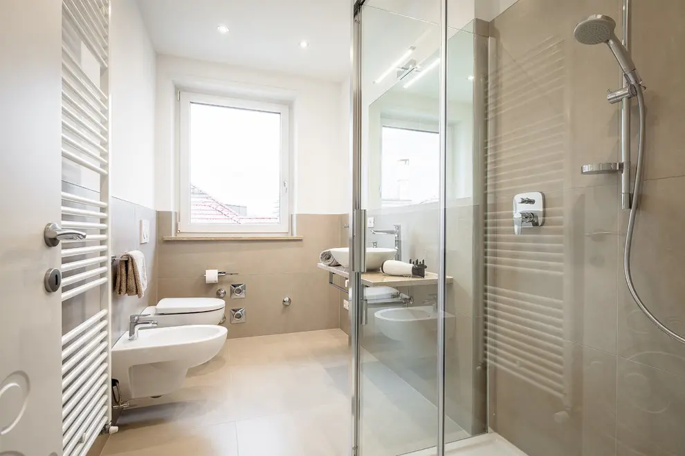 Baia pastreaza acelasi ambient prezent in restul apartamentului. Nuante de bej se imbina cu albul obiectelor sanitare pentru a spori senzatia de bine si relaxare.