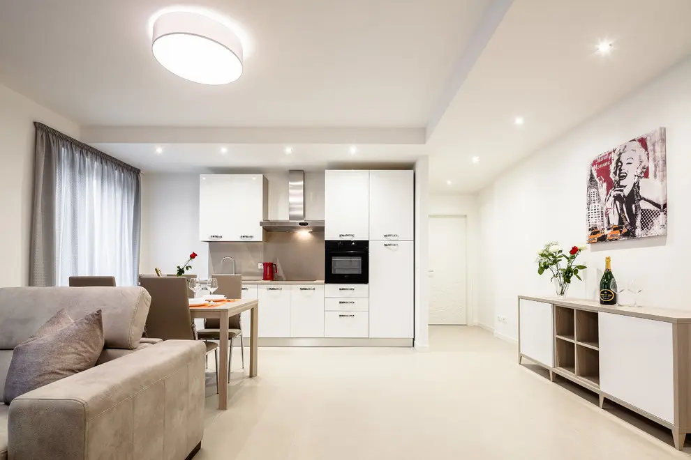 In privinta optimizarii spatiului disponibil, acesta se bucura de zone ample, deschise, puse in valoare prin alegerea unor culori neutre sau a unor suprafete extinse vopsite in alb. Aceste suprafete sporesc luminozitatea camerelor si creeaza o atmosfera de relaxare in intregul apartament.