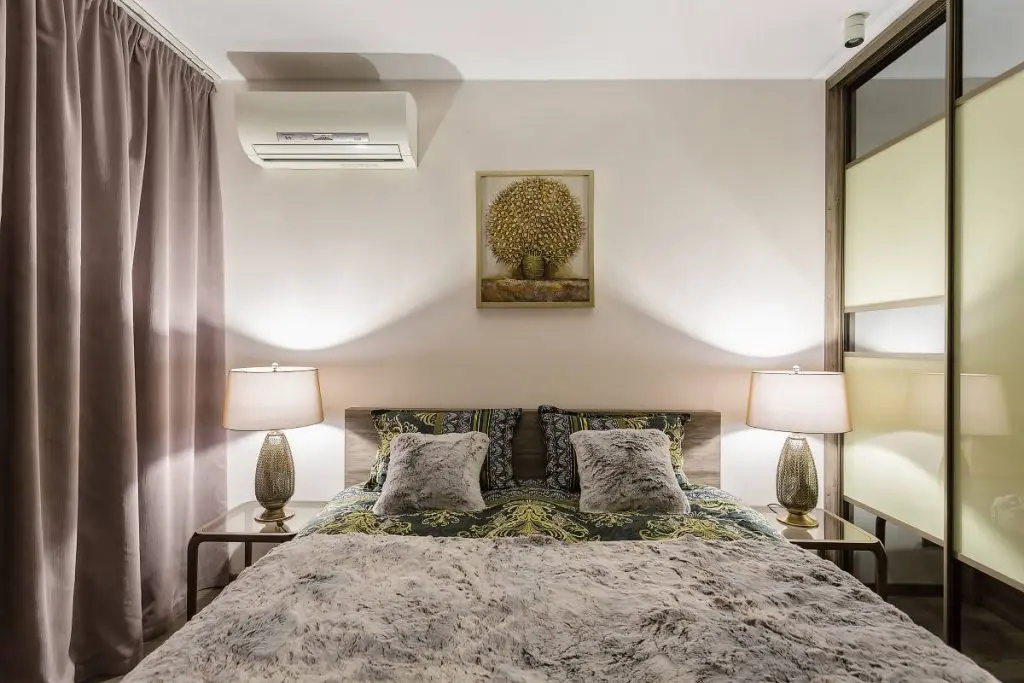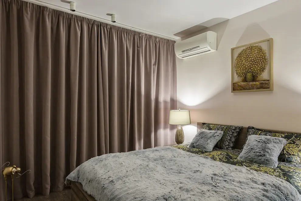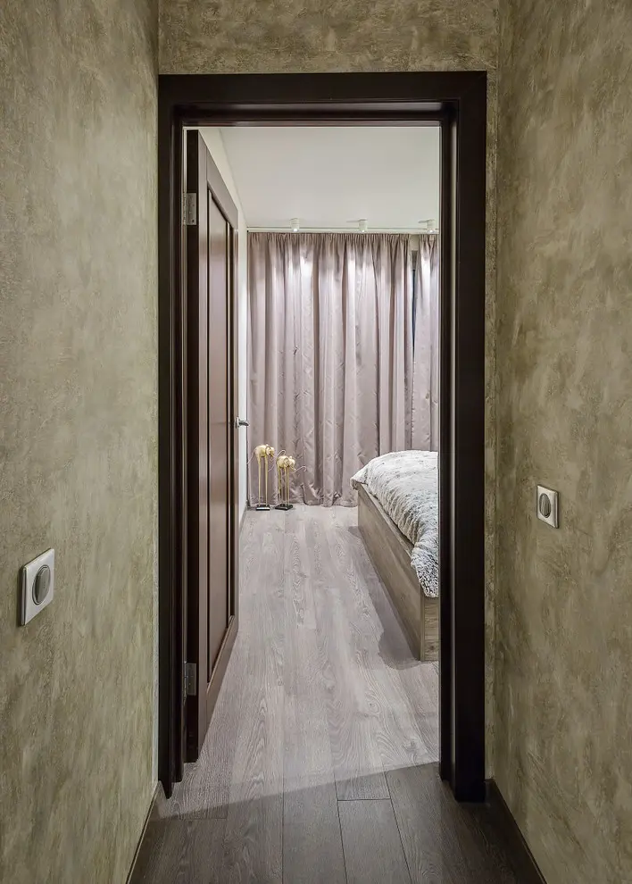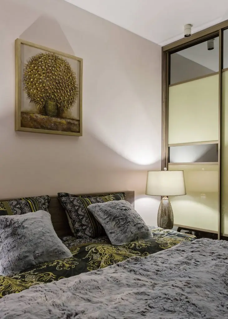 Pentru dormitor a fost conturata o amenajare menita sa-ti rasfete simturile. Bogatia de texturi, nuantele blande si calde precum si luminile difuze descriu un ambient confortabil, relaxant. Spatiul avut la dispozitie nu este mare, dar a permis integrarea unui dulap pentru haine, cu usi glisante si fatete cu oglinzi. Efectul de largire a spatiului este vizibil in special pe timpul zilei, cand oglinzile reflecta lumina naturala.