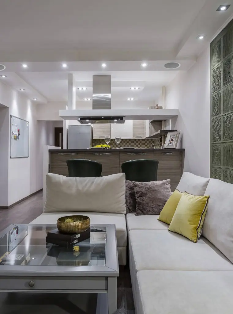 Deschide GaleriaLocuinta cuprinde trei camere, cu o bucatarie in plan deschis, birou sau camera de oaspeti la nevoie si un dressing generos. Amenajarea a fost gandita pentru un cuplu tanar, cu o zona de zi dedicata activitatilor sociale, de aici si dorinta de a avea o bucatarie open space.