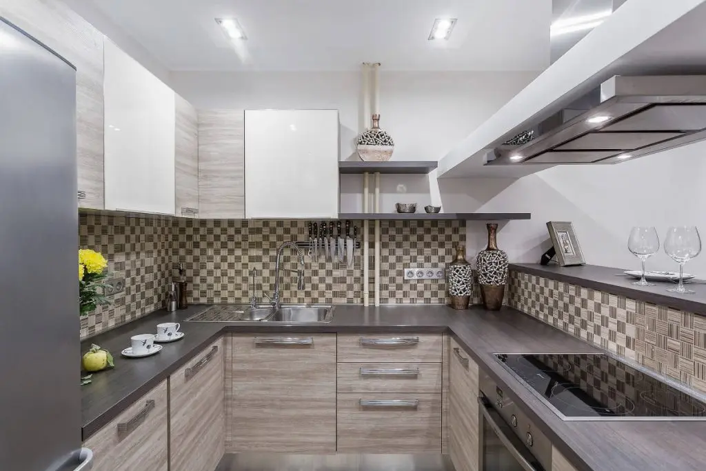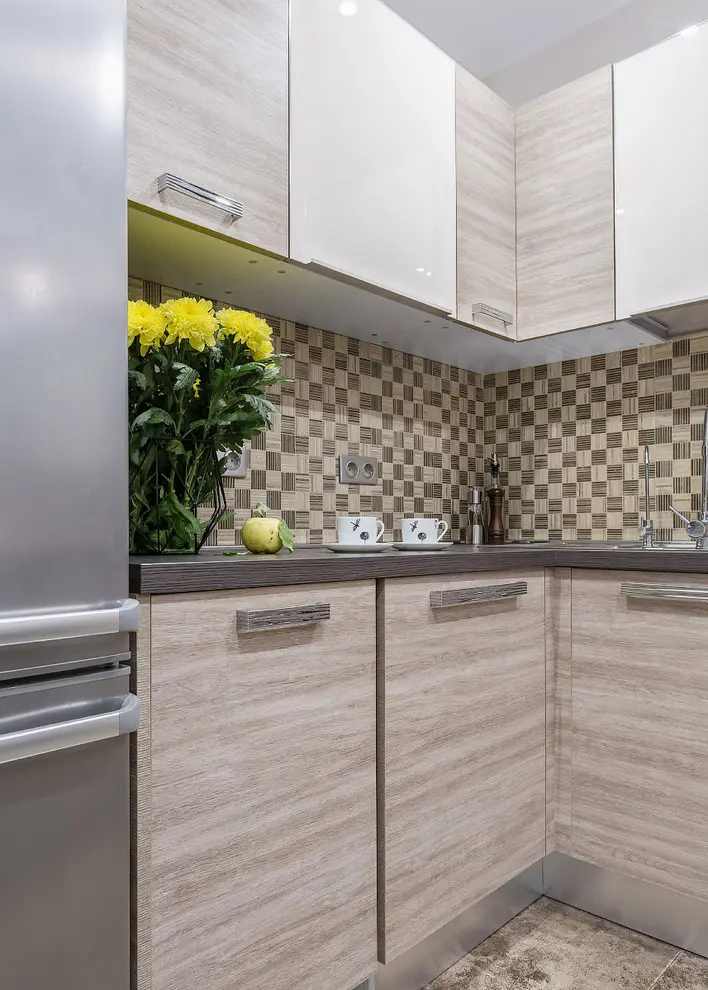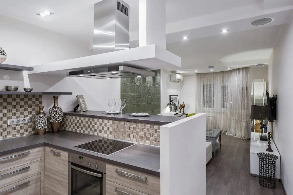Zona bucatariei pe care o gasim in continuarea livingului, ne propune o amenajare compacta, cu o dispunere pe trei laturi. Acest aranjament permite un numar mare de spatii de depozitare si asigura cel mai bun randament de lucru pentru ca ai la indemana toate cele trei zone de lucru dintr-o bucatarie, numit si triunghiul de lucru. Desi restransa, aceasta bucatarie asigura tot ce ai nevoie pentru a gati si depozita. Pentru a delimita vizual cele doua functiuni, a fost creata o mica zona tip bar, ce incorporeaza si ea spatii de depozitare, putand fi folosita si ca loc pentru luat masa.