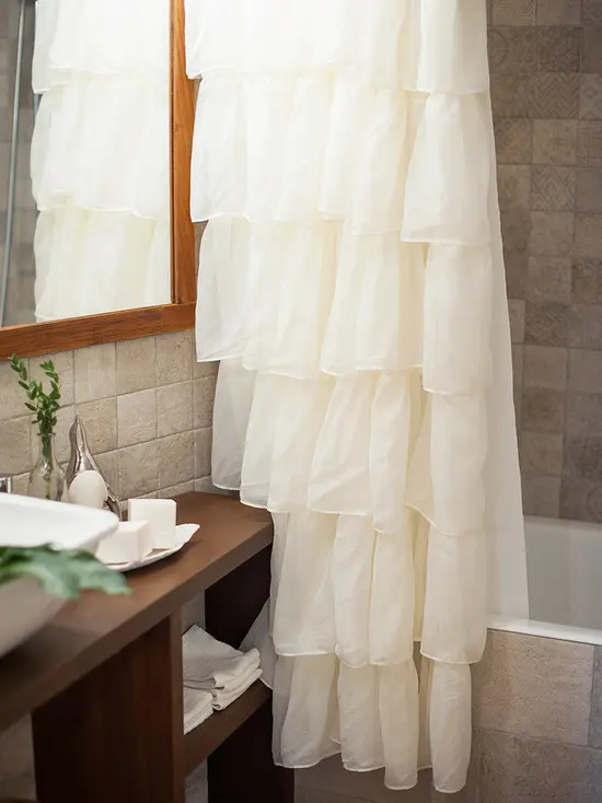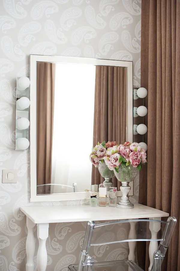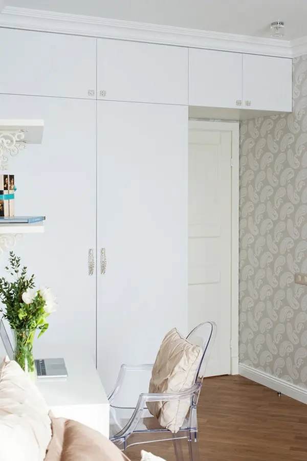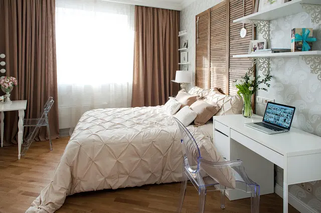 In dormitorul matrimonial, designerul a ales un decor in nuante neutre, calme, de crem, pana la maroul draperiilor. Elementele de accent nu lipsesc nici de aici. Asa cum in living avem un perete cu tapet si semineu fals, aici gasim un interesant detaliu cu obloane, un fel de ferestre false amenajat deasupra patului. Dorind sa creeze cat mai mult spatiu pentru depozitare, dulapul de haine se prelungeste printr-un corp suspendat deasupra usii de la intrarea in camera. Tot aici, a fost amenajat si un mic spatiu de lucru precum si un loc de infrumusetare cu o masuta-consola si o oglinda cu lumini tipice camerelor de machiaj. Decorul inspira un aer usor romantic prin designul si detaliile mobilierului.