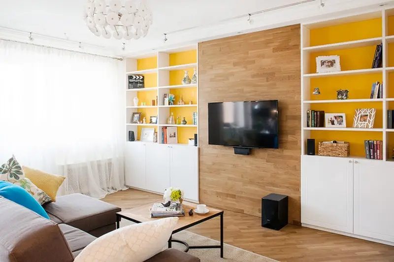 In zona de living, corpurile de biblioteca incastrate in perete asigura o unitate vizuala, liniara. Rafturile deschise, albe si peretele zugravit cu galben iti atrag privirea de la spatiul care nu prea iti ofera foarte multa libertate de miscare. Panoul placat cu parchet pe care este asezat televizorul imparte in mod simetric cele 2 corpuri de mobilier. Canapeaua si o masuta de cafea cu un blat asemanator panoului creioneaza compozitia acestei functiuni.