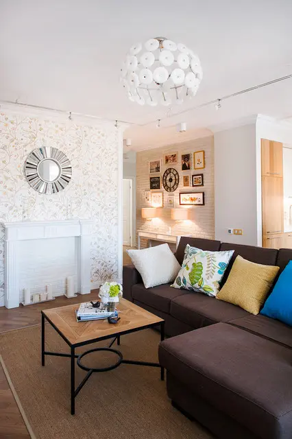 Camera se bucura de lumina naturala ce amplifica spatiul. Astfel, atat zona livingului cat si cea a bucatariei are o buna luminozitate, potentata de contextul predominant al albului. Amenajarea este una de inspiratie scandinava, dar mai colorata si mai vioaie decat interioarele clasice nordice.
