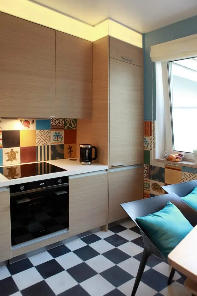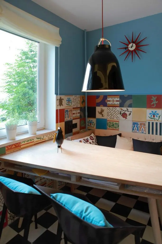Tinand cont de orientarea nordica a camerei, designerul a ales o abordare mai colorata, vie, dinamica. Pretextul vacantelor iberice a servit de minune scopului final – o bucatarie mai luminoasa, mai primitoare pentru toti ai casei si nu numai. Placile decorative tip patchwork incep din perimetrul blatului de lucru si se continua pe peretele ferestrei incluzand si pe cel cu bancuta. Pentru pardoseala a ales o varianta clasica, tip tabla de sah.