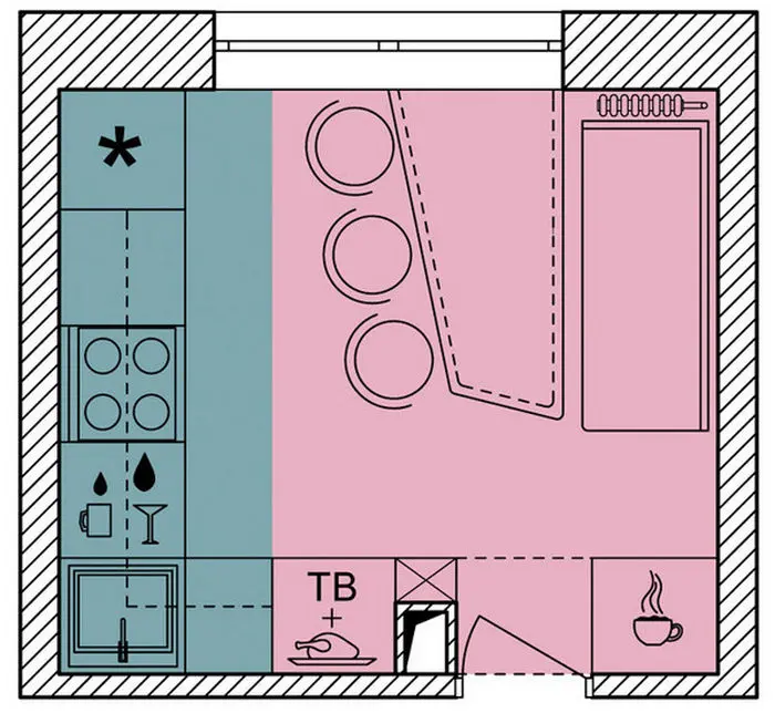 Pe langa spatiul tehnic ce cuprinde zonele de lucru specifice unei bucatarii, designerul a prevazut corpuri simetric dispuse de o parte si cealalta a usii. Dulapurile integrate aduc un plus destinat depozitarii. Avem astfel un loc pentru a aseza scaunele pliante, dar si un corp in care a fost incorporat un espressor (sau cuptor cu microunde, dupa caz). Corpul cu rafturi este un loc excelent pentru decoratiuni specifice sau carti.