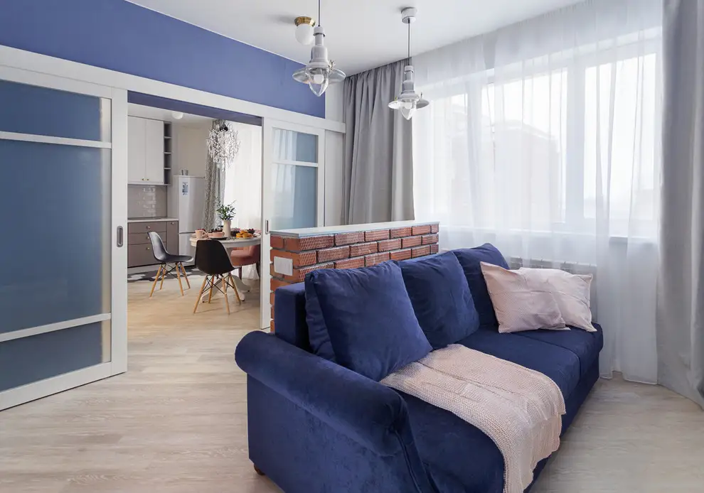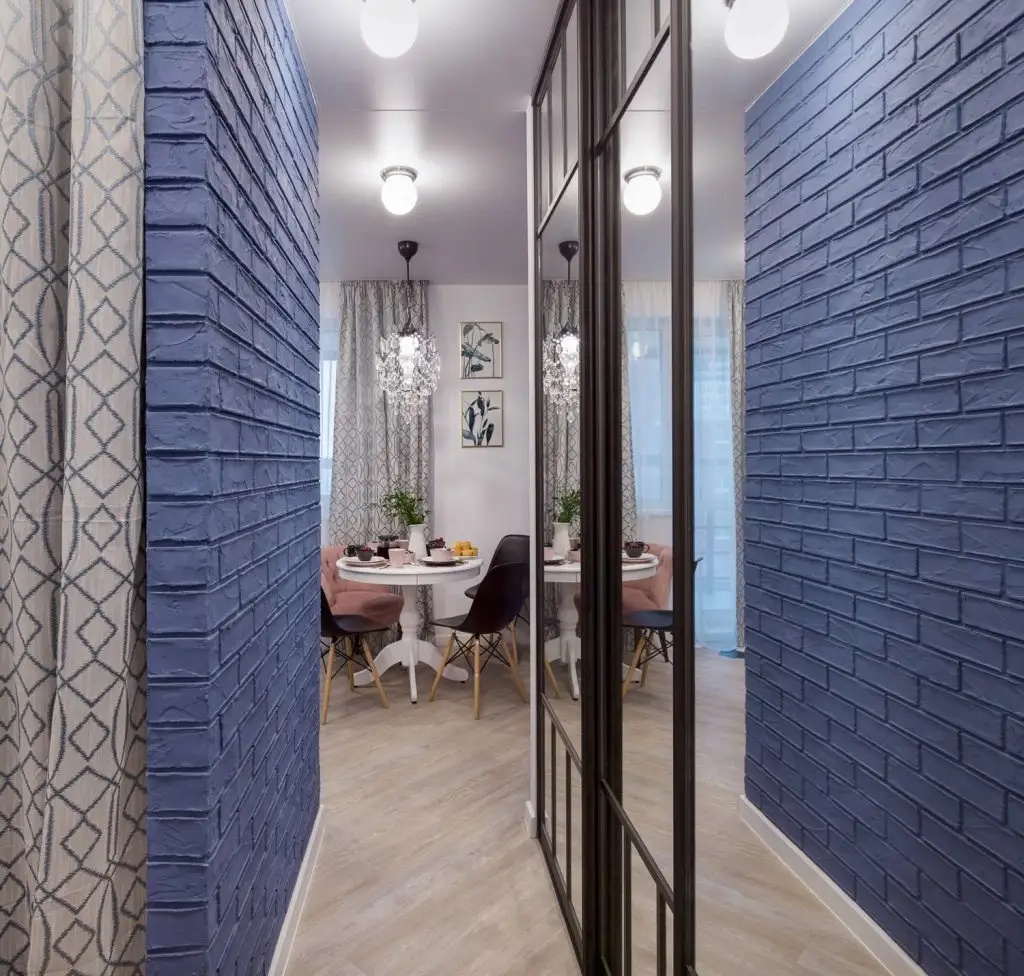 Asezarea mesei in apropierea usilor nu este intamplatoare, fiind un liant spre zona de living. Aici, peretele-partitie cu textura de caramida apare odata pentru a delimita canapeaua de un mic birou si apoi pentru a delimita zona de dormitor. Albastrul este reluat si aici, sub forma peretelui-accent care marcheaza zona TV sau al canapelei.