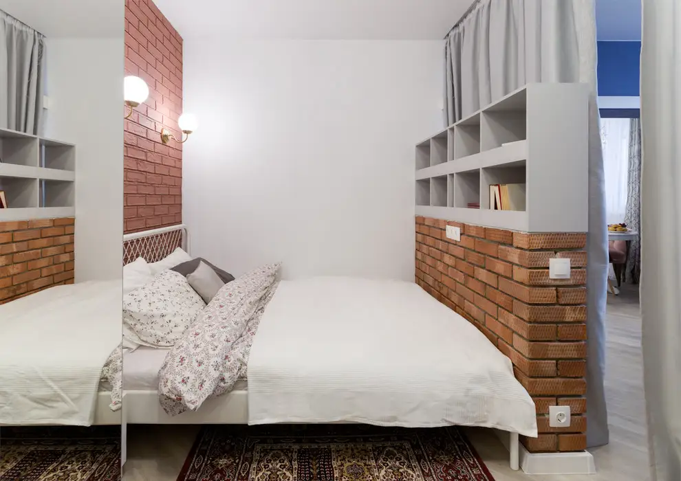 Micul dormitor cuprinde un pat si un dulap pentru haine. Oglinzile de pe usi reflecta lumina si largesc spatiul. Draperia odata trasa, ofera un plus de intimitate acestui mic dormitor.
