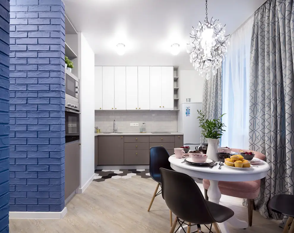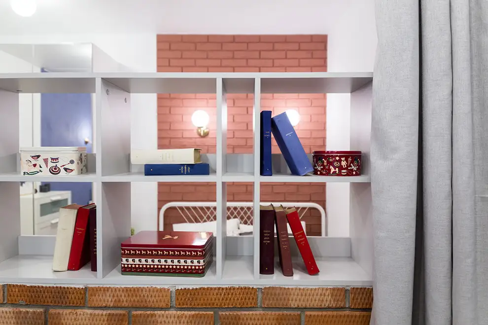 Cromatic, albastrul domina amenajarea, completat de rosiaticul specific al caramizilor. In restul spatiului se pastreaza o baza neutra, cu alb care echilibreaza culorile accent folosite.