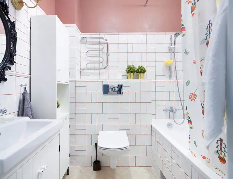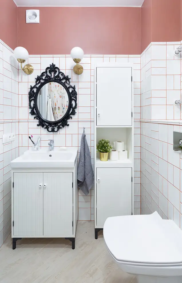Neconventionalul il vom intalni si in baie, fie prin oglinda, prin dispunerea placilor ceramice sau vopsirea peretului in partea superioara intr-o nuanta caramizie asemanatoare celei utilizate si in restul amenajarii.