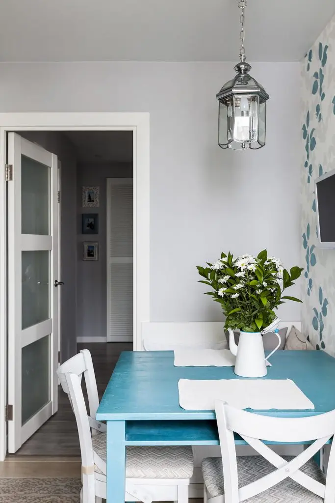 Pentru ca spatiul sa para mai mare, au optat pentru vopsea in ton de gri light, deschis, de la Dulux. Au avut si optiunea albului, insa griul pe care l-au si testat in prealabil s-a dovedit a fi o alegere mai inspirata; reprezinta fundalul pe care au adaugat accente discrete de culoare si chiar un perete-accent cu tapet in zona de luat masa din bucatarie.