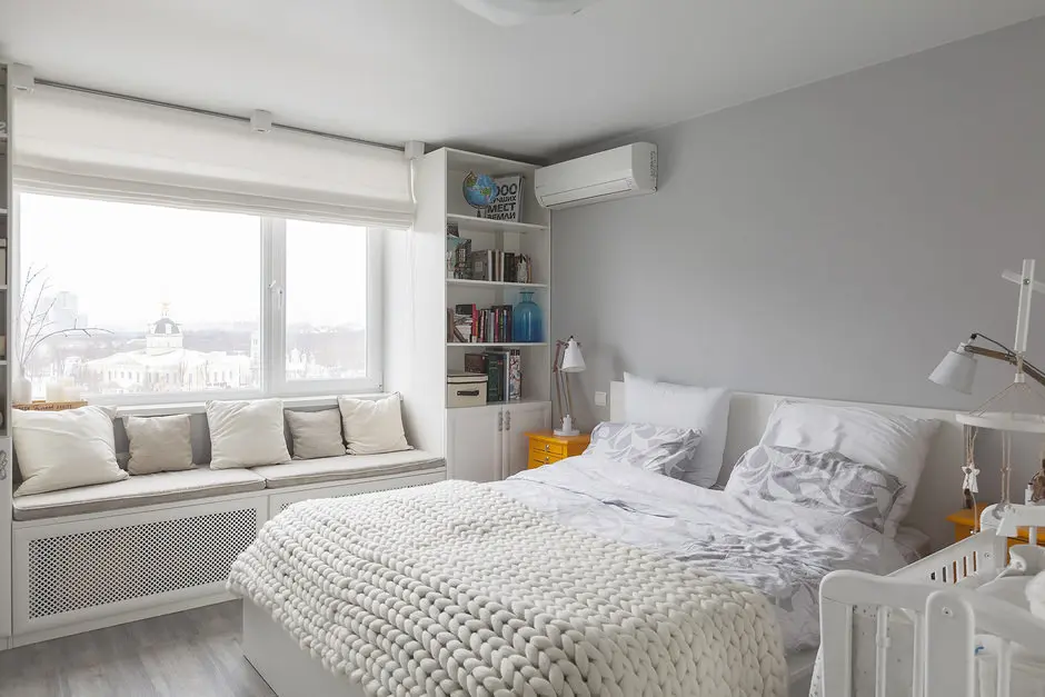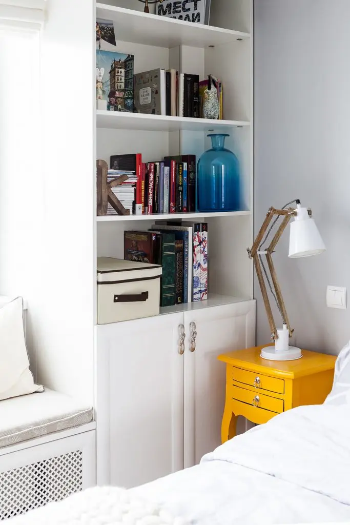 Dormitorul este o camera privilegiata prin prisma privelistii de care te poti bucura. De fapt, acesta a fost punctul de plecare in amenajare. Avand panorama in minte, au gandit aceasta dispunere cu banca sub fereastra, iar de o parte si cealalta au integrat doua corpuri de depozitare. Toate piesele sunt albe, inclusiv mastile de calorifer sau draperia in stil roman. Petele de culoare vin de la noptierele galbene si decoratiunile din interior. Din fericire, spatiul le-a permis sa integreze si un dressing pentru haine.