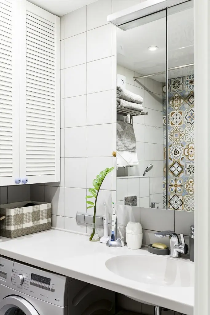 Bine optimizat a fost si spatiul din baie. Au reusit sa monteze masina de spalat rufe chiar sub blatul lavoarului, iar in partea superioara sa adauge doua dulapuri, unul cu usi tip oblon si celalalt cu usi acoperite cu oglinzi.