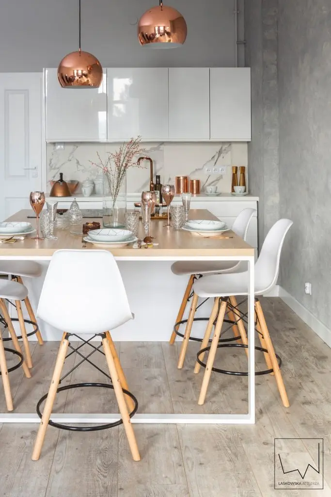 Pretiozitatea rozului auriu, cel care da tonul esteticii actuale, isi pune amprenta indeosebi in spatiul bucatariei si zonei de dining. In cazul locului de pregatire a mesei se opteaza pentru un mobilier alb lucios, cu design minimalist, lipsit de manere, care contrasteaza perfect cu rozul auriu al bateriei si restul accesorilor metalice.
