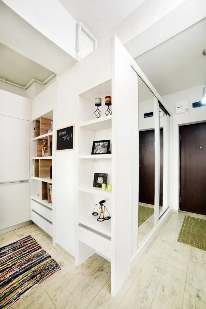 Spatiul din hol diverse spatii de depozitare inclusiv un dulap pentru haine