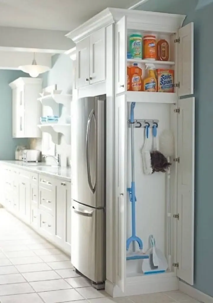 In mobilerul nefinisat este necesar sa te gandesti si la un spatiu de depozitare a obiectelor de curatat. Bucataria este intr-adevar un loc unde tot timpul ai ceva de sters, de maturat si de spalat, asa ca nu ar strica sa ai aproape toate aceste lucruri. Se pote sa folosesti orice “soldat” incorporat in mobila de bucatarie caruia sa ii atasezi un mic dulap. Daca “soldatul” se deschide in fata, dulapiorul sa se deschisa pe lateral, pentru a se putea ascunde solutiile, matura si mopul de curatat.