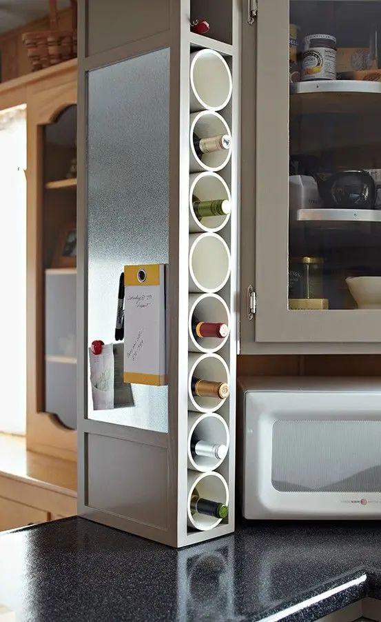 Pentru sticlele de vin sau orice alte sticle aratoase sau doar pur si simplu importante pentru “casa omului” aveti posibilitatea de a aseza pe blatul mobilei de bucatarie un raft dispus pe verticala inserat cu cilindre. Corpul nou format nu ingite spatiul datorita cilindrelor este practic si estetic.