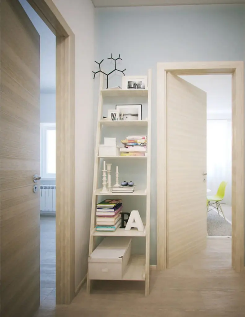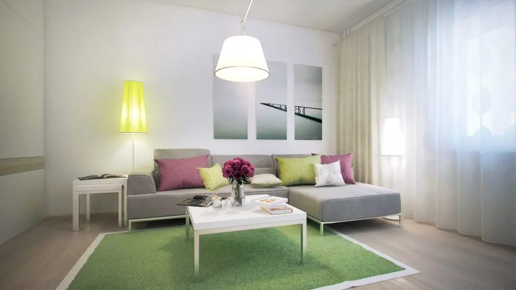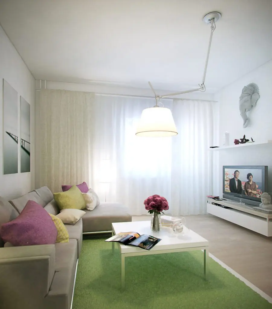 Pentru ca vorbim despre un apartament cu o camera, livingul se transforma noaptea in spatiu de dormit prin extensia canapelei. Sistemul compact de mobilier asigura spatii de depozitare atat de necesare; tot aici gasim integrat si un mic spatiu pentru birou si etajere sub forma unei scari. Accentele de verde si pernele colorate, precum si micile detalii decorative insufletesc decorul si il personalizeaza intr-un mod placut.