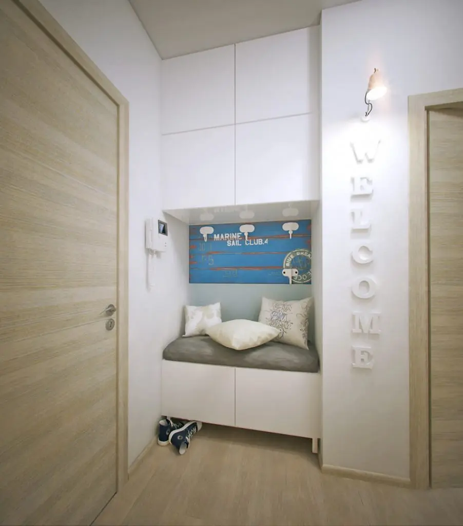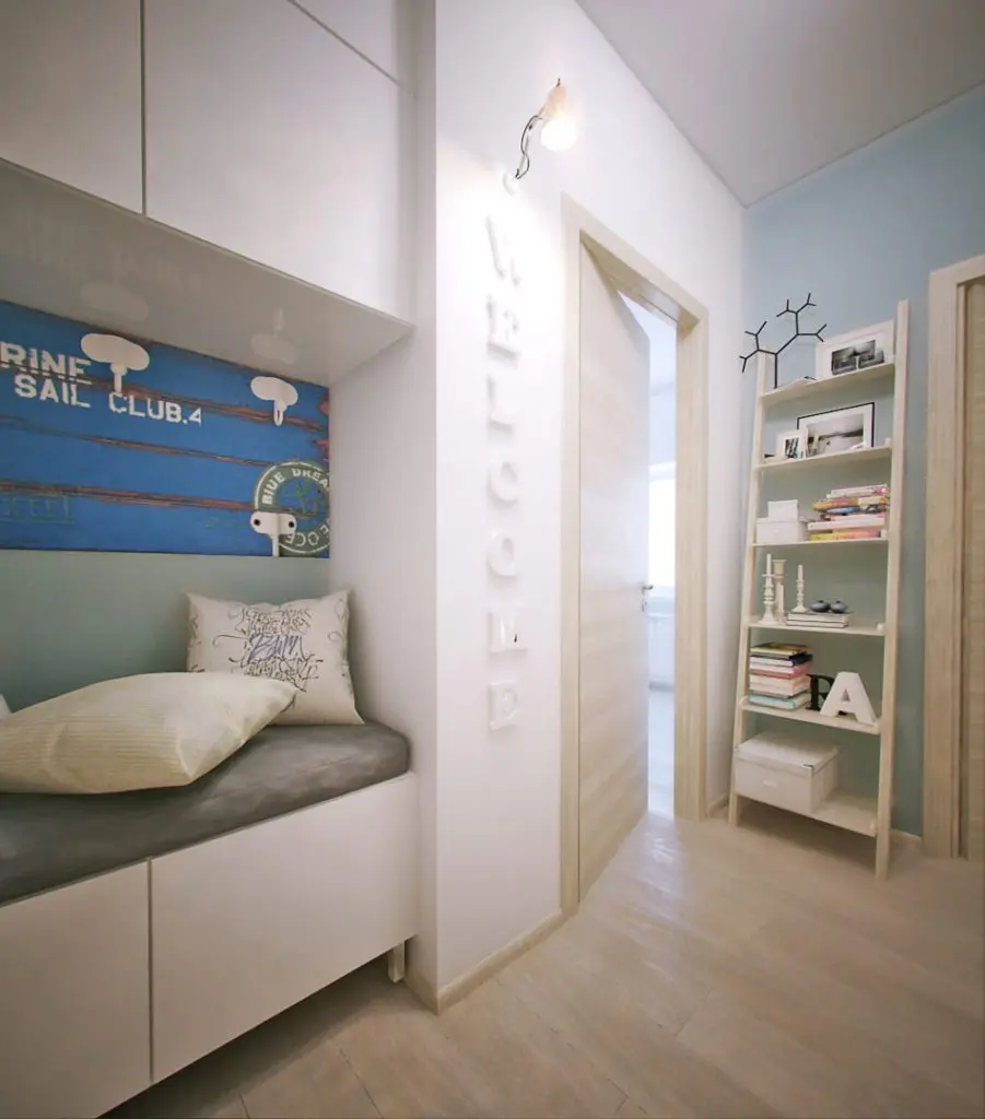 Personalizat este si spatiul holului prevazut si el cu dulapuri si o bancuta, precum si un mesaj de bine ai venit! care ar putea fi personalizat cu orice alt text in functie de spatiu si dispunere.