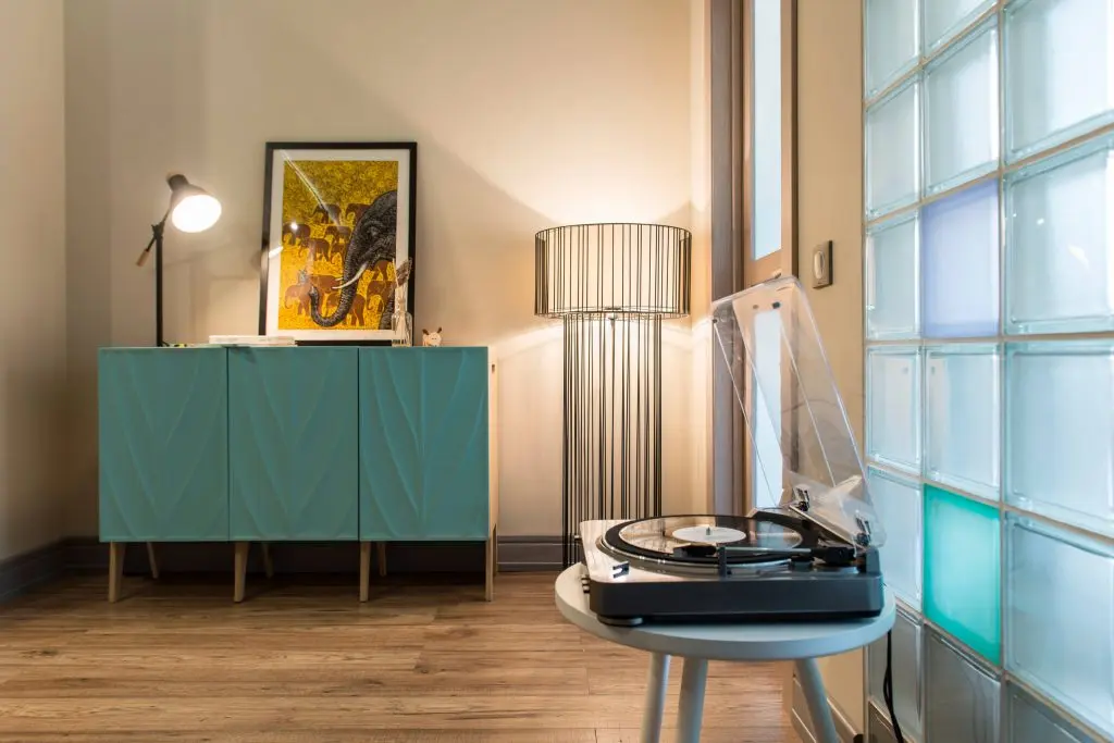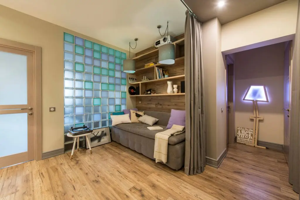 Facand loc unei noi camere (cea a copilului), livingul in forma sa actuala ar fi ramas fara lumina naturala. Pentru a corecta acest inconvenient, designerii au creat o partitie din sticla groasa, dar colorata, astfel ca, sub o anumita forma, aceasta camera primeste o cantitate de lumina.